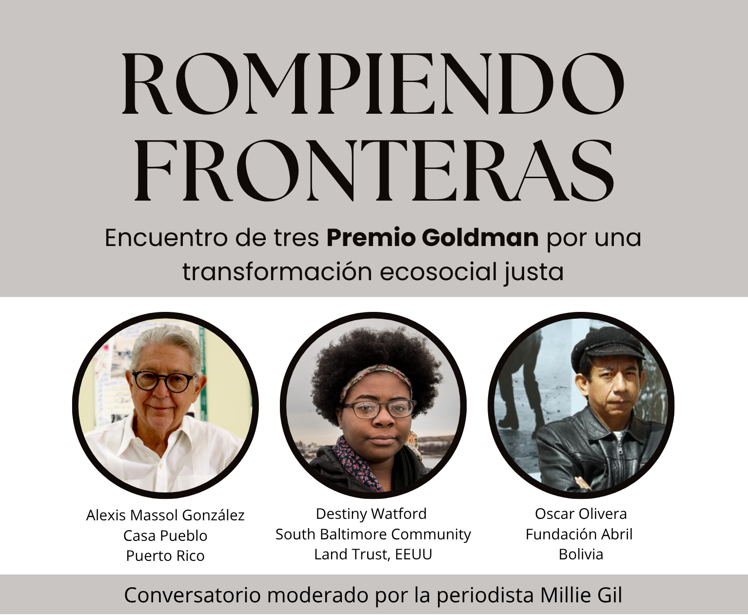 Se trata de Alexis Massol González (2002), cofundador y director de Casa Pueblo; Oscar Olivera (2001), de la Fundación Abril de Cochabamba en Bolivia; y Destiny Watford (2016), de South Baltimore Community Land Trust en Maryland, Estados Unidos.